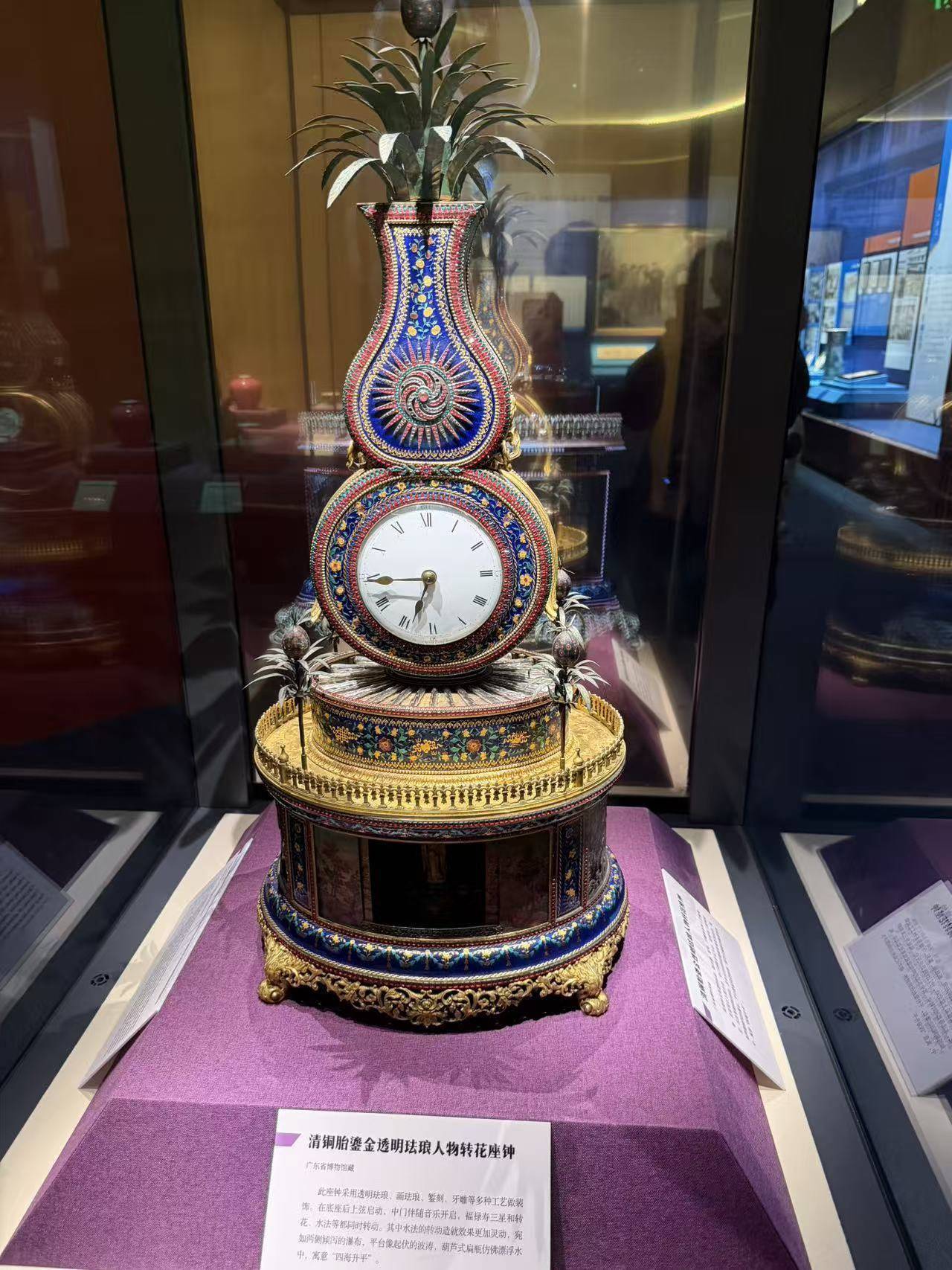 清铜胎鎏金透明珐琅人物转花座钟。 经济日报记者 喻剑摄